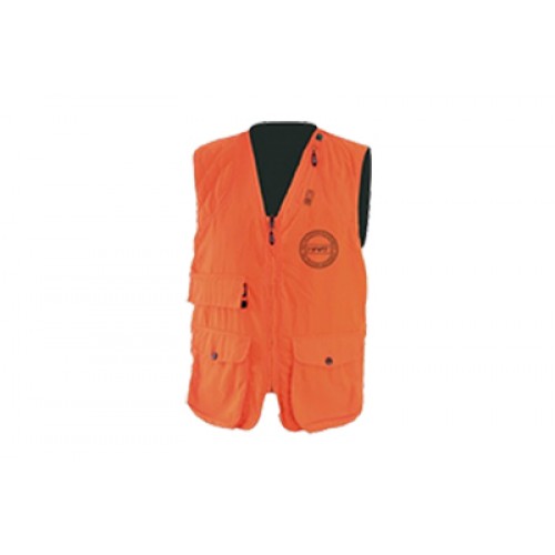 Chaleco naranja de seguridad para batidas. Canana para munición metálica con tapeta en el exterior. Bolsillo con gadget para emisorajunto al cuello. Bolsillos cargo con cananas. Fabricado en robusta tela rip stop y forro de malla para aumentar la transpirabilidad. Tejido laminado con teflón hidrorepelente.